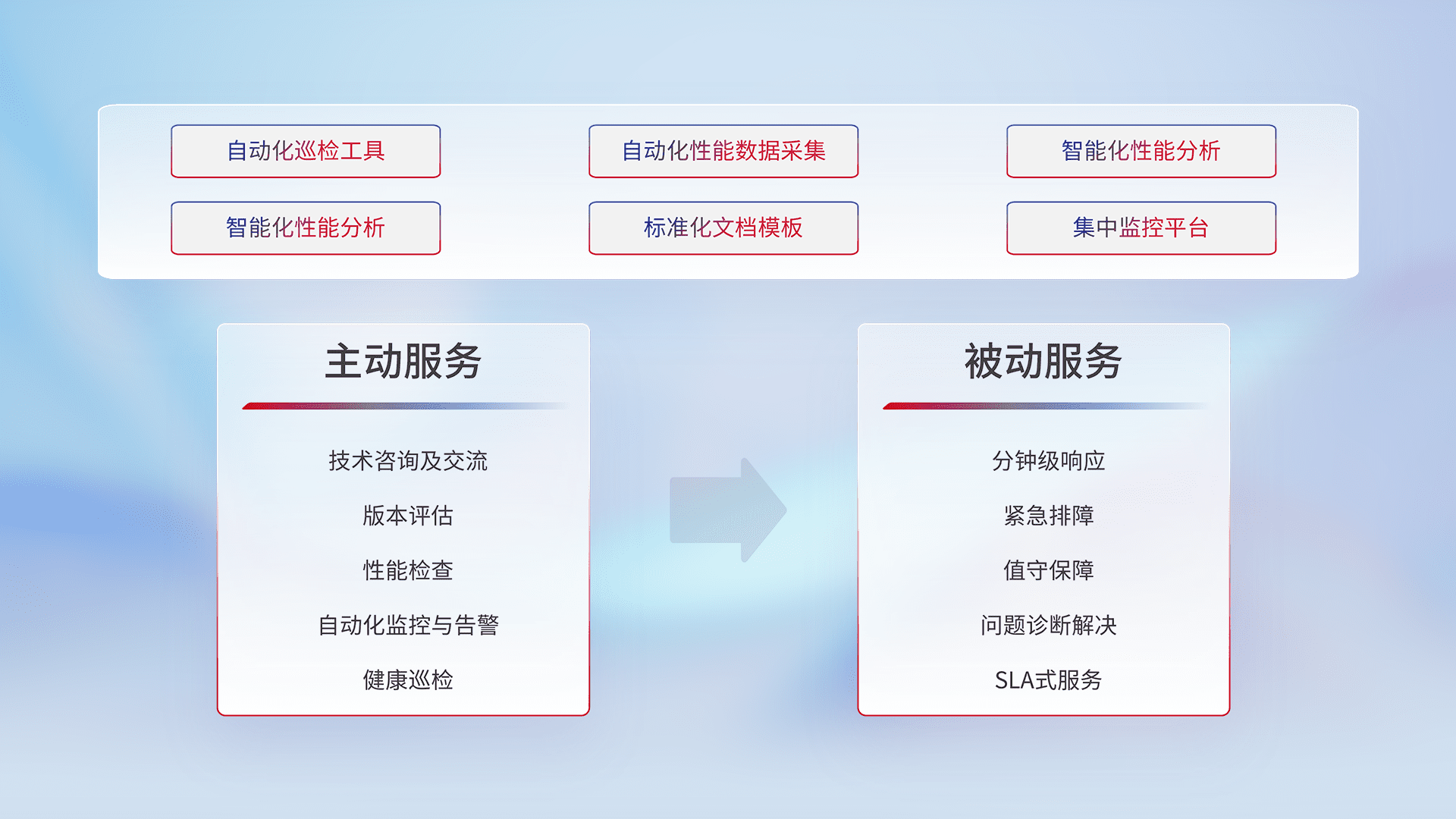 智能化工具和标准化文档,,,保障服务质量,,提供主动服务(包含技术咨询、、、、版本评估、、、性能检查、、、、自动化监控与告警、、健康巡检)和被动服务包含(分钟级响应、、紧急排障、、、值守保障、、问题诊断解决、、SLA服务)。。。